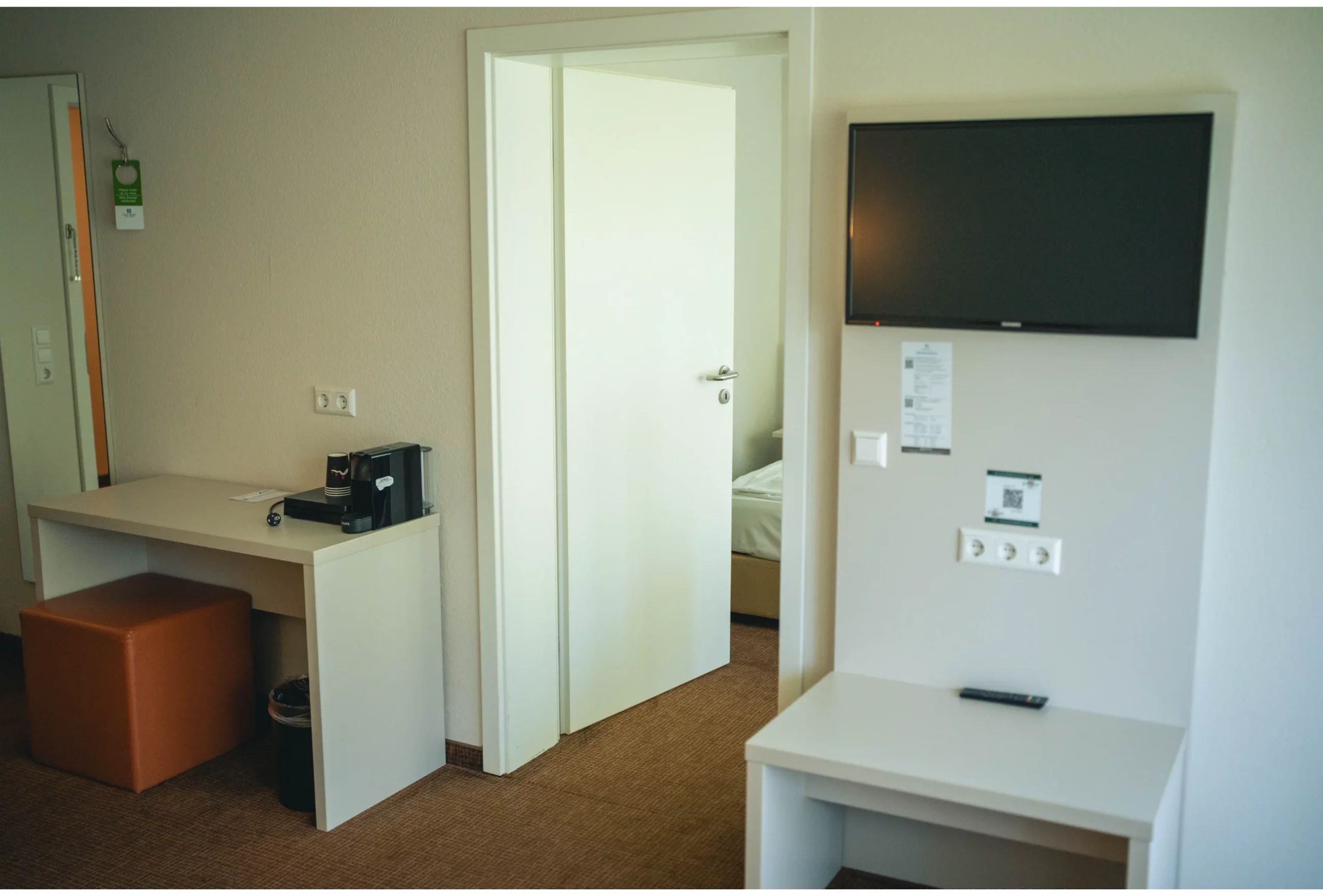 Unser Junior Suite bietet eine komfortable Unterkunft für einen erholsamen Aufenthalt. Das Zimmer ist modern und stilvoll eingerichtet, mit einem großzügigen Doppelbett, einem Schreibtisch und einem geräumigen Kleiderschrank. Die warmen Farben schaffen eine gemütliche Atmosphäre, in der Sie sich sofort wohlfühlen können. Zur Ausstattung gehören ein Flachbildfernseher mit einer Auswahl Satellitensendern und ein Schreibtisch. Natürlich ist auch kostenfreies WLAN verfügbar, damit Sie immer in Verbindung bleiben können. Die überwiegenden Zimmer verfügen über einen Balkon, auf dem Sie frische Luft und eine tolle Aussicht gießen können. Das Badezimmer ist mit einer Dusche oder Badewanne, einem Waschbecken und einer Toilette ausgestattet. Zusätzlich erwarten Sie Pflegeprodukte, ein Föhn und weiche Handtücher, um Ihren Aufenthalt noch angenehmer zu gestalten. Unsere Junior Suite eignet sich hervorragend für Gäste, die zusätzlichen Raum und Komfort suchen, sei es für einen längeren Aufenthalt oder einfach, um den Aufenthalt noch angenehmer zu gestalten. Sie bietet eine perfekte Mischung aus Luxus und Funktionalität und ist ideal für Paare, die einen gehobenen Standard zu einem fairen Preis genießen möchten.