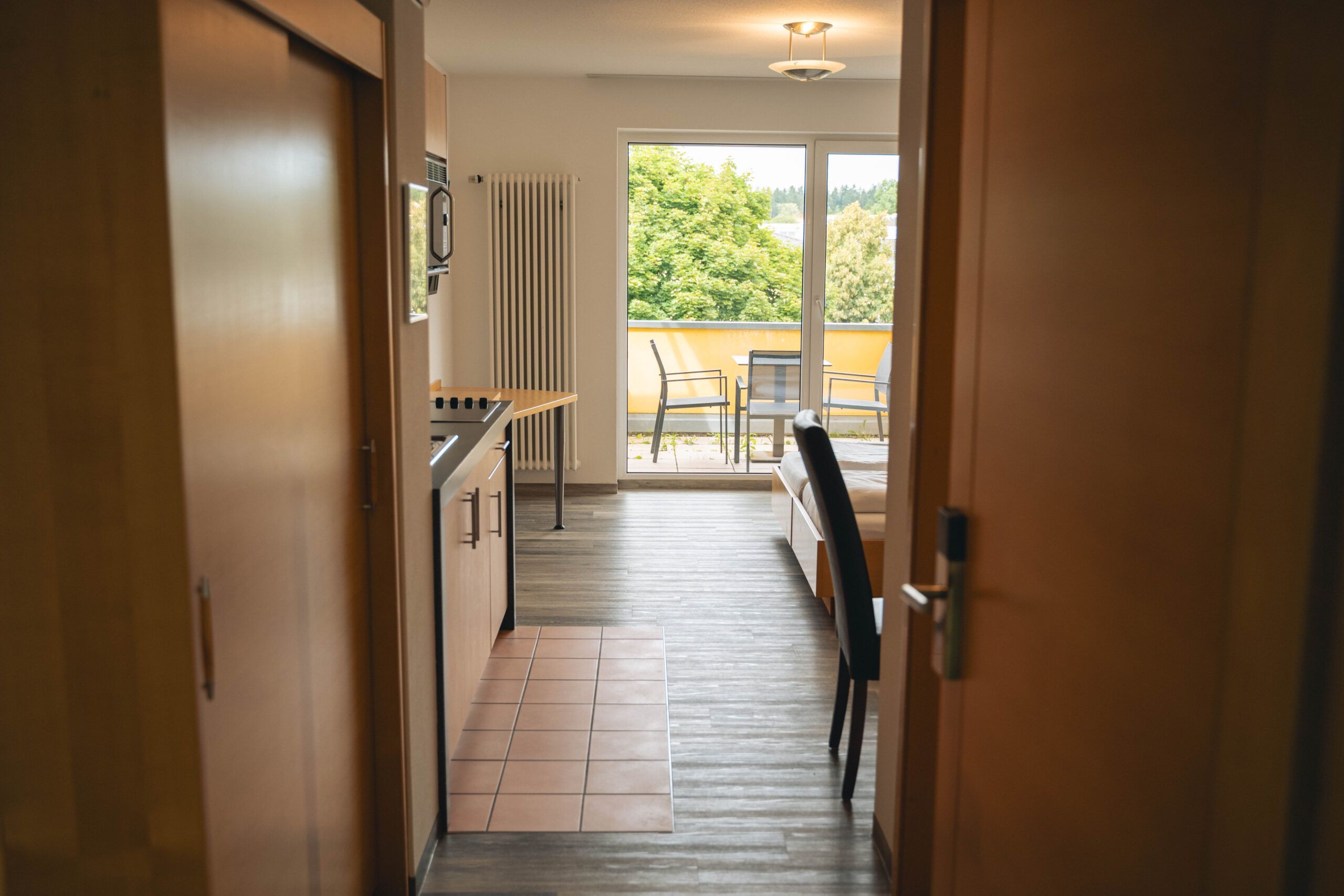 Für einen kurzen Aufenthalt bietet sich unser 1-Zimmer-Apartement mit Doppelbett und vollwertiger Küchenzeile und Balkon geradezu an.